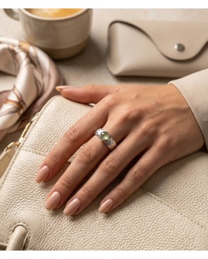 380,00 złPierścionek z prehnitem w klasycznej oprawie, umieszczonym na szerokiej, lekko pękatej i fakturowanej obrączce. Wykonany w całości ręcznie ze srebra 925.