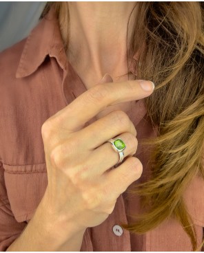 400,00 złPierścionek wykonany ręcznie. Fasetowany peridot naturalny, został osadzony w złoconej oprawie na szerokiej, lekko pękatej obrączce o fakturowanej powierzchni. Srebro pr. 925..