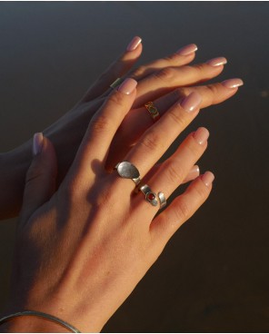 400,00 złWyrazisty i pełen charakteru, pierścionek wykonany ręcznie od podstaw ze srebra 925. Naturalny, fasetowany granat - kamień odwagi, oprawiony w srebro złocone 24k złotem..