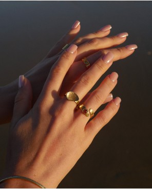 400,00 złPierścionek wykonany ręcznie. Fasetowany kwarc dymny, został osadzony w złoconej oprawie na szerokiej, lekko pękatej obrączce o fakturowanej powierzchni. Srebro pr. 925. Oprawa.