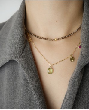 340,00 złDelikatny naszyjnik na łańcuszku ze srebra złoconego, kompozycja kamieni naturalnych w oprawie - peridotu, rubinu i kamienia słonecznego. Srebro próby 925, pokryte 24k.